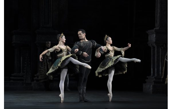 Sofia Liñares and Yaoqian Shang as the Two Courtesans and Brandon Lawrence as Prince Siegfried.
